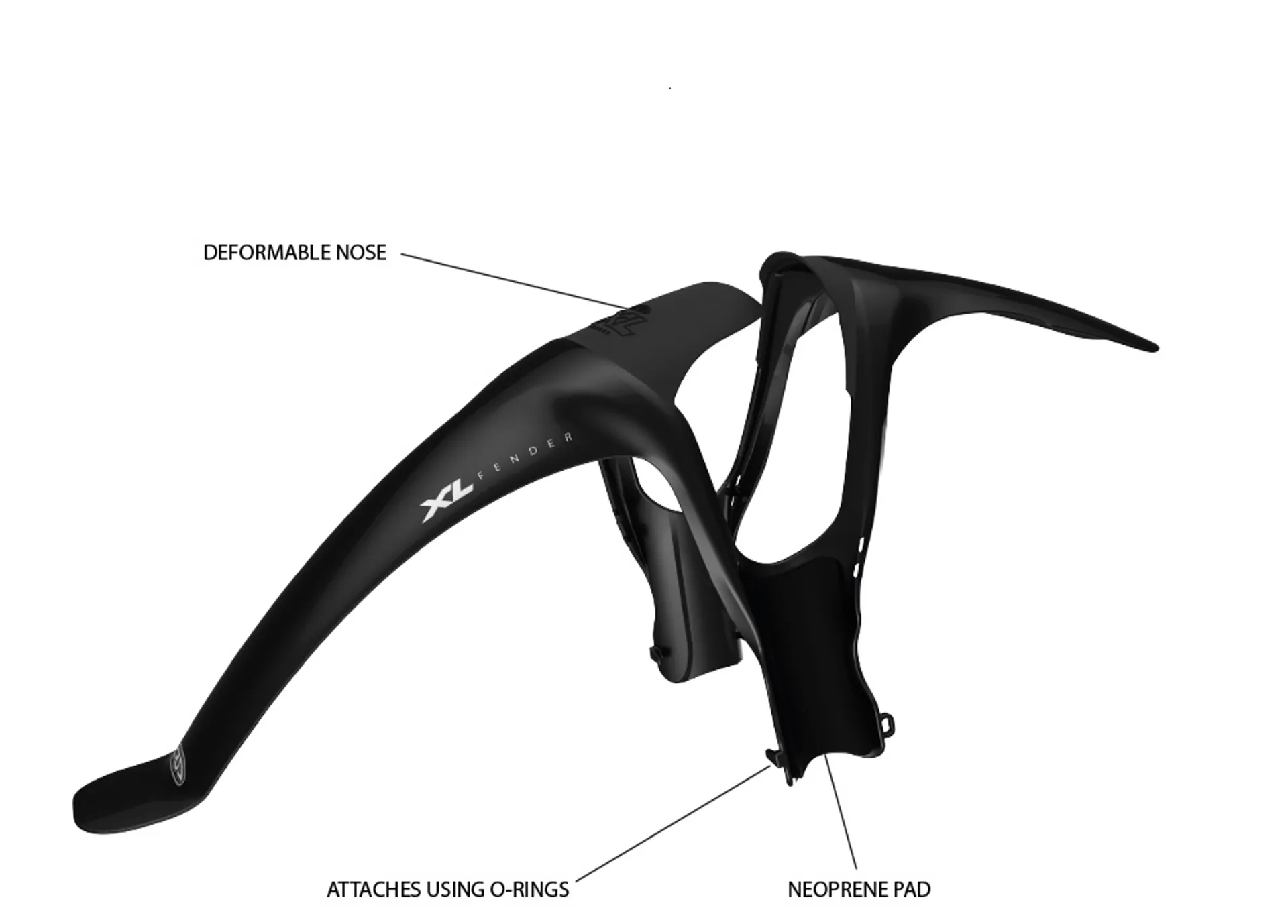 Full front mudguard, with its soft nose the XL cannot clog up with mud and stays in place during the roughest ride.